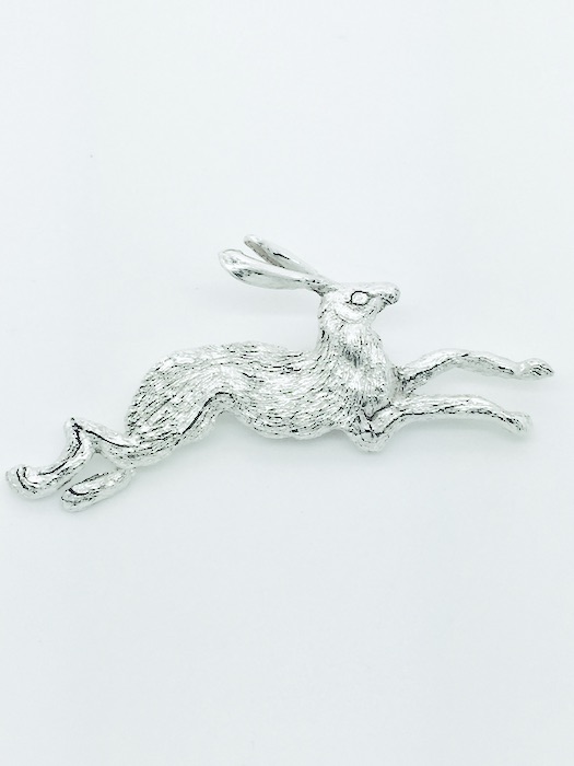 Large cast silver leaping hare brooch. Made using the technique of lost wax casting where each piece starts as a detailed wax model. A standout, statement piece.