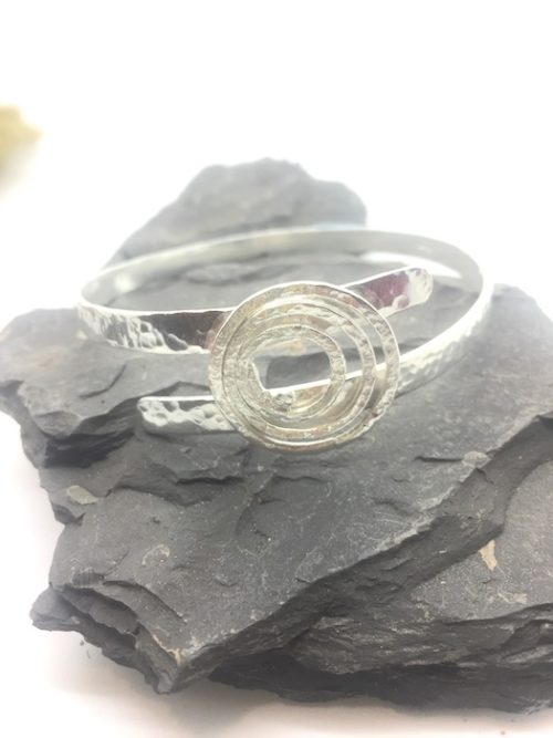 Hammered silver adjustable overlap bangle. Finished with triple, graduated circle.